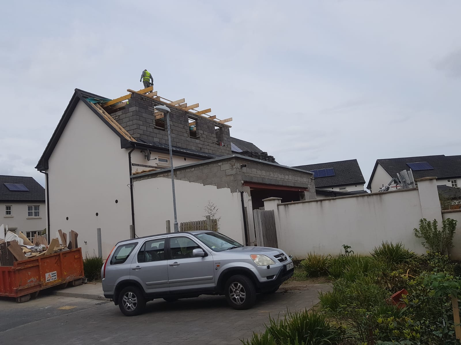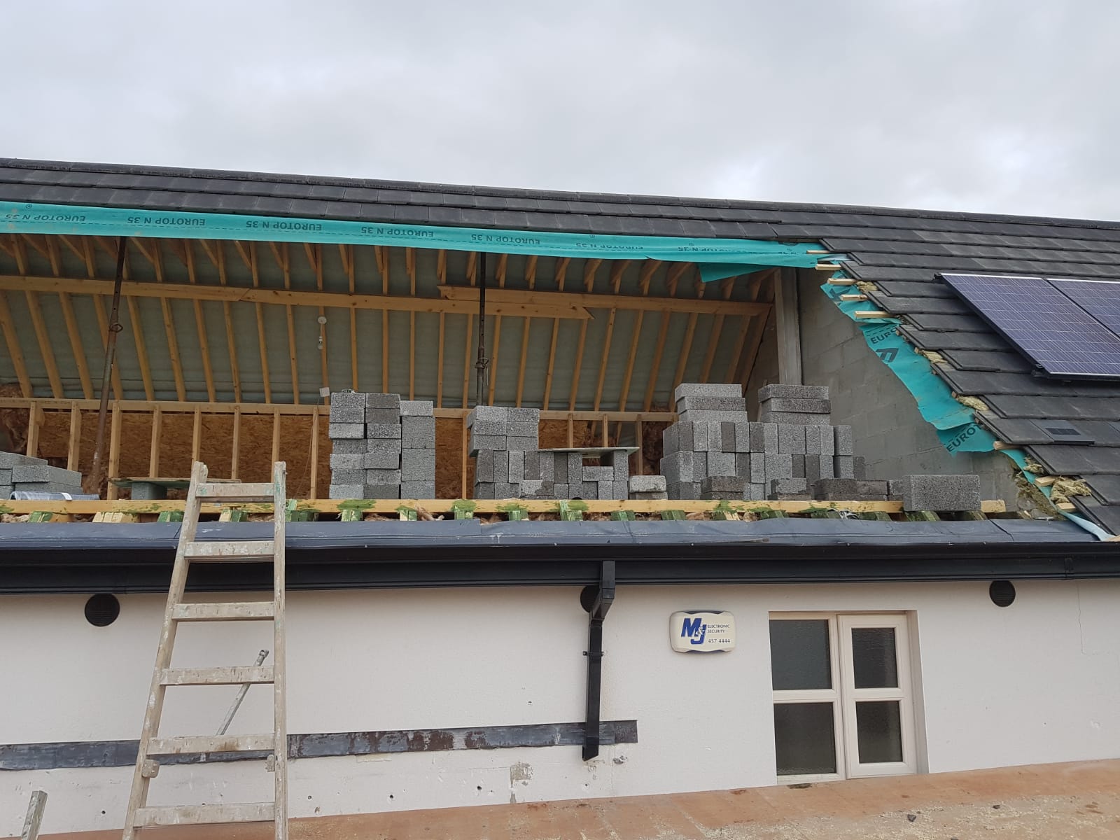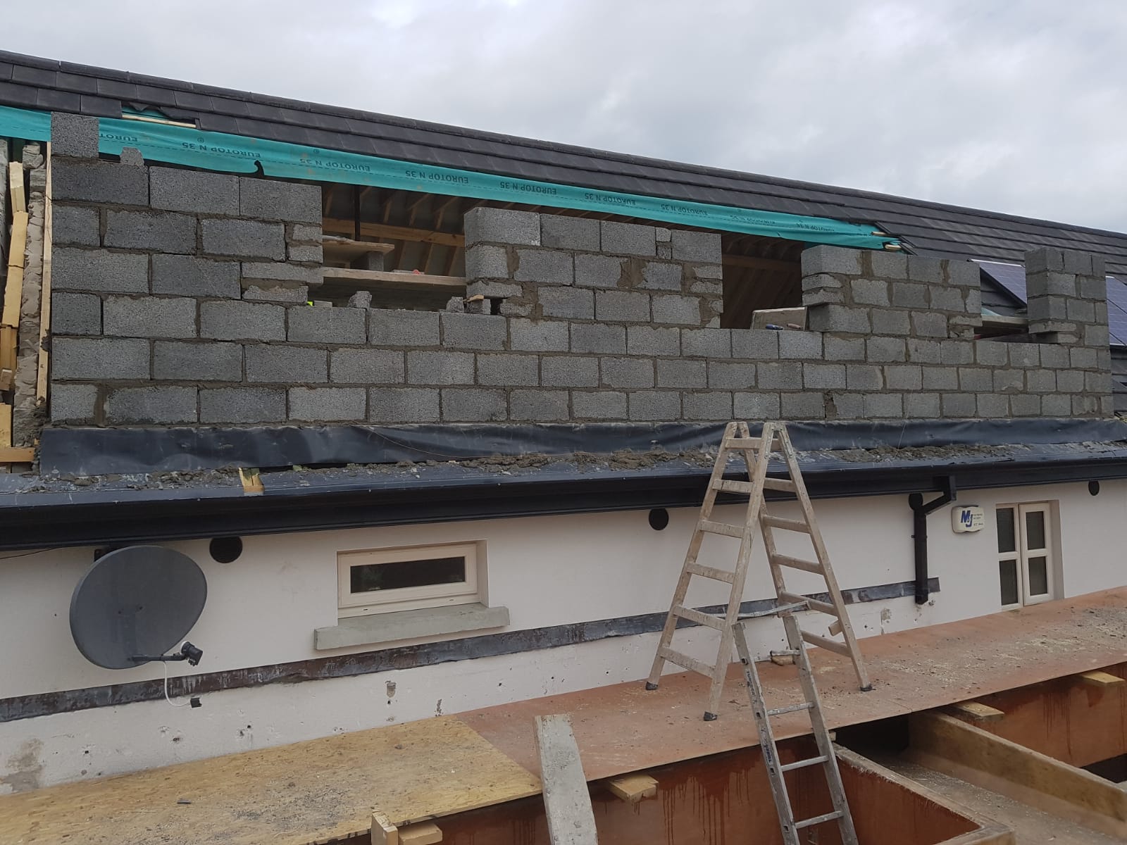 In the meantime, we did the structure work in the dormer upstairs, removed a section of the roof, fitted steelwork necessary for an attic conversion, instructed by the engineer. We then built the blockwork, added a flat roof with a fibreglass finish.