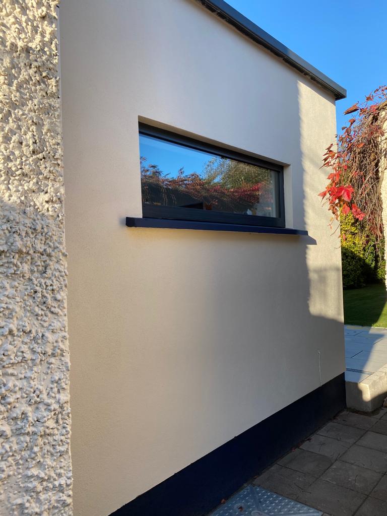 We then fitted plasterboards and skimmed all walls and ceilings, and plastered the outside with white sand-cement.